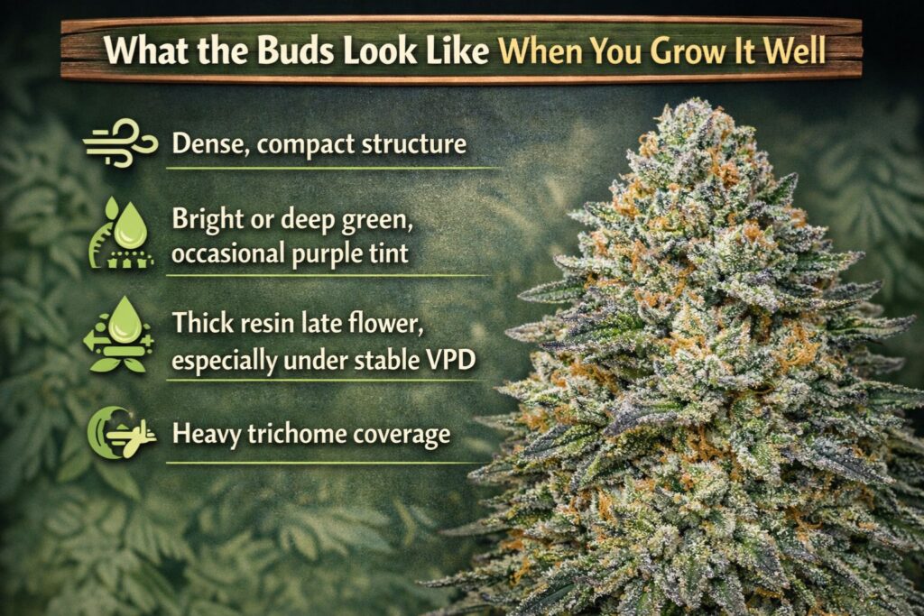 - Thick resin in the final 2–3 weeks, especially when VPD is stable