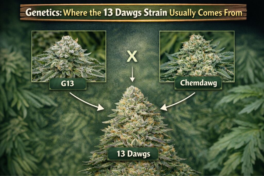 Most descriptions trace the 13 Dawgs strain back to G13 and Chemdawg. That pairing makes sense from a grower’s perspective: