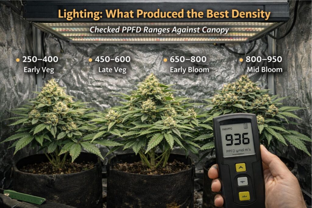 I re-check the PPFD map for a 4×4 tent after training and again after stretch, because both change the canopy distance and the PPFD map for a 4×4 tent you started with.