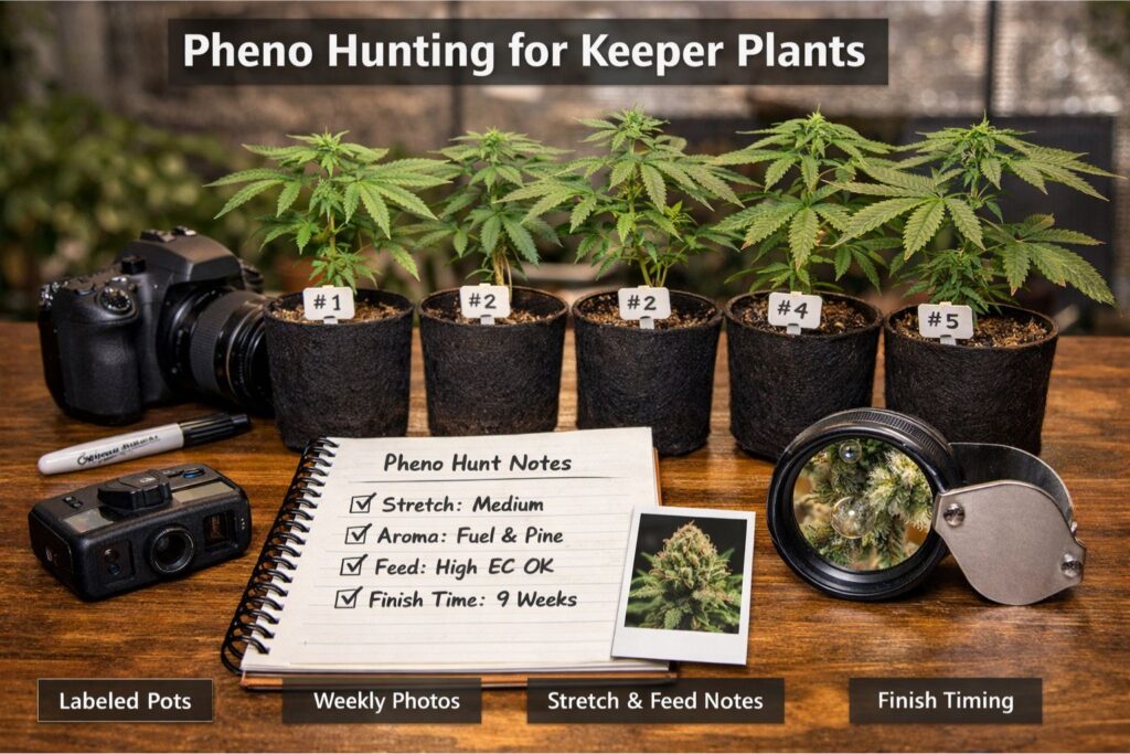 Pheno logging for keepers. Keep notes on stretch, aroma, yield, and how the buds dry. Pheno logging for keepers turns one good run into a repeatable run.