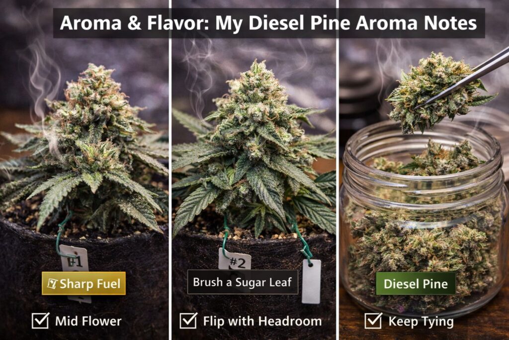 In the best batches, the jar leads with fuel, then opens into evergreen and a darker, earthy base. I summarize it as diesel pine aroma notes with a “forest floor” tail. Those diesel pine aroma notes get louder when the plant finishes without stress and when the dry is controlled. If I rush harvest or dry too warm, the diesel pine aroma notes thin out fast.