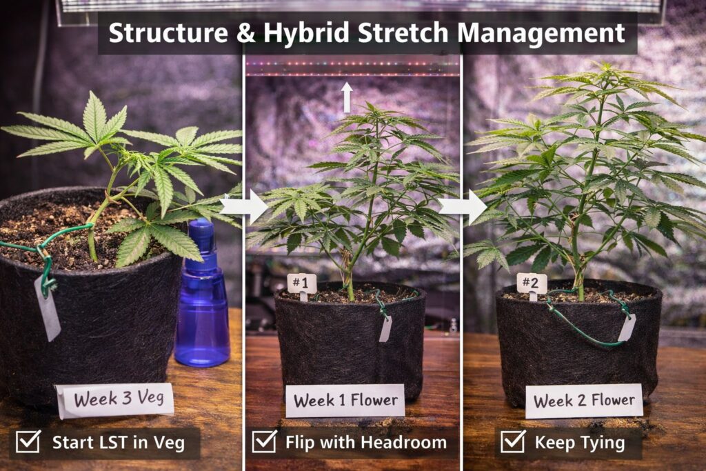 Hybrid stretch management works best when it’s gentle and consistent. Start early, bend little by little, and keep hybrid stretch management going through the first two weeks of flower.