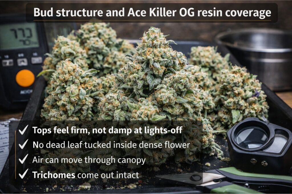 Use trichomes and plant behavior to choose the Ace Killer OG harvest window, then confirm with the first jars after cure.