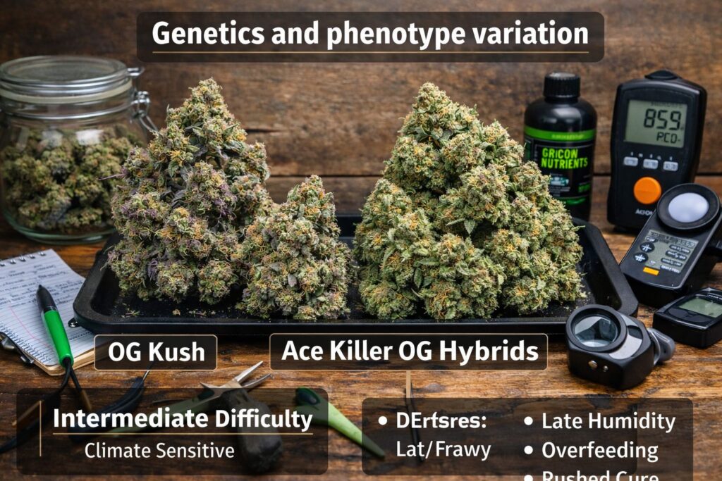 - Flat aroma late: review Ace Killer OG late flower humidity, night swings, and whether Ace Killer OG canopy airflow is blocked.