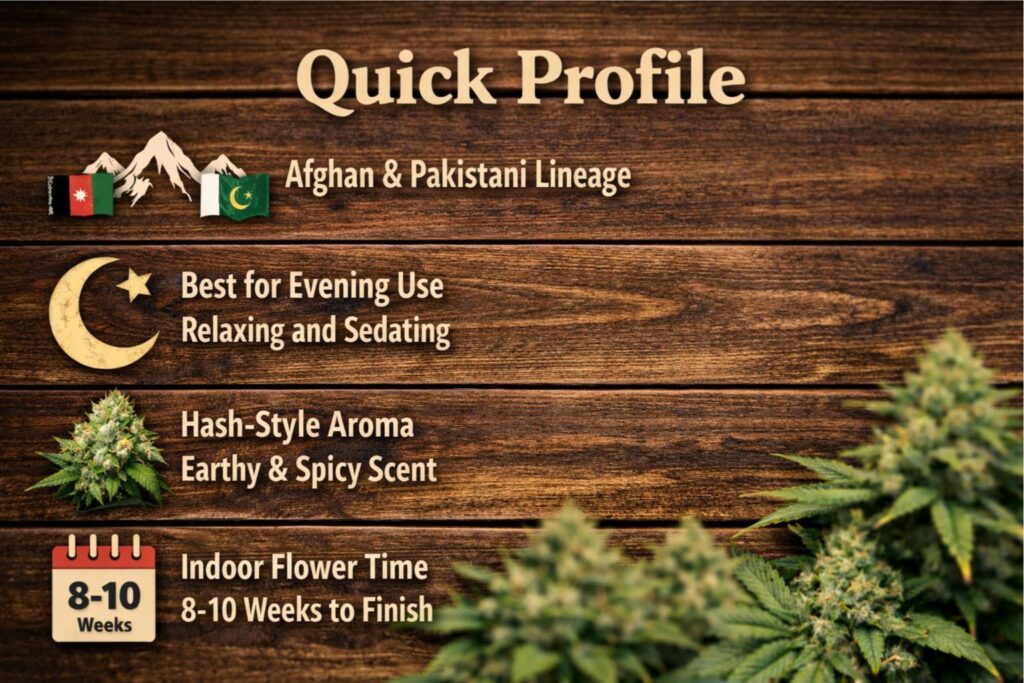 - Type: indica-leaning hybrid often linked to Afghan and Pakistani heritage