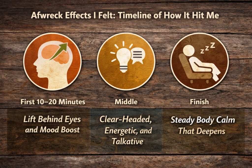 Afwreck effects are dose-dependent and personal, and they can vary with harvest window and cure. With my best batch, the onset was fairly quick. I’d describe it like this: