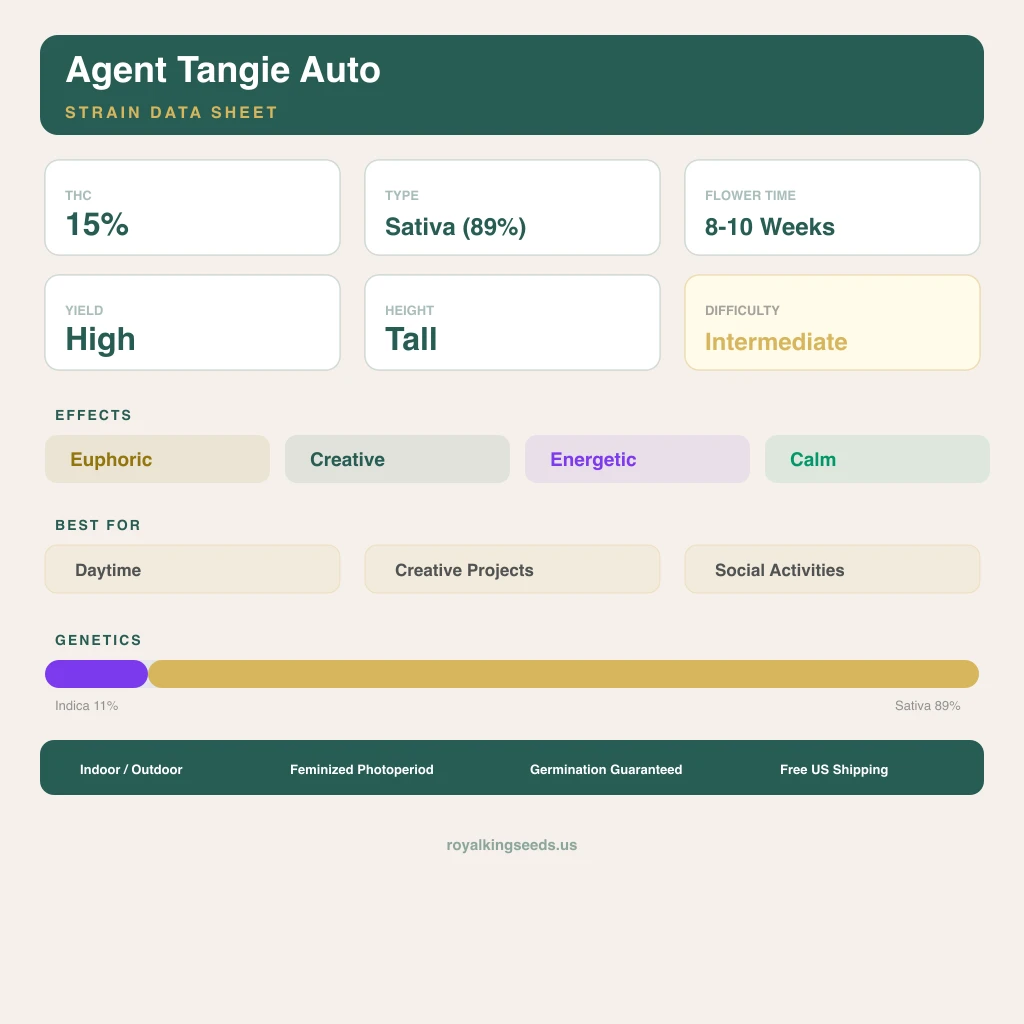 In the grow room, Agent Tangie manages its height better than pure sativa genetics. Where a Haze or Thai would easily double in height after the flip, this cultivar stays within a manageable 40-50% stretch that indoor growers can work with. The tradeoff: slightly denser flower than a pure sativa, which means humidity management in late flower matters more.