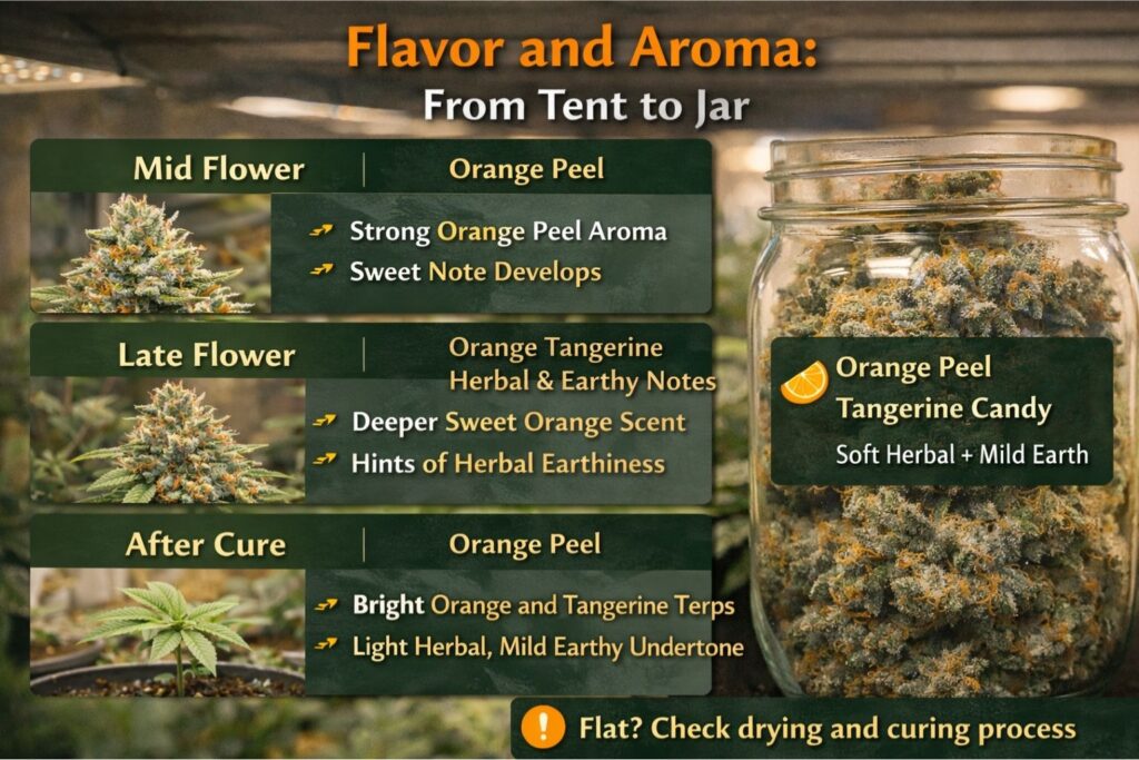 During veg, stem rubs were already citrus. Mid flower is where it turned obvious: bright orange peel aroma in marijuana with a candy edge, especially after lights-on when plants started transpiring. Late flower added a deeper sweet note, but the citrus stayed front and center.
