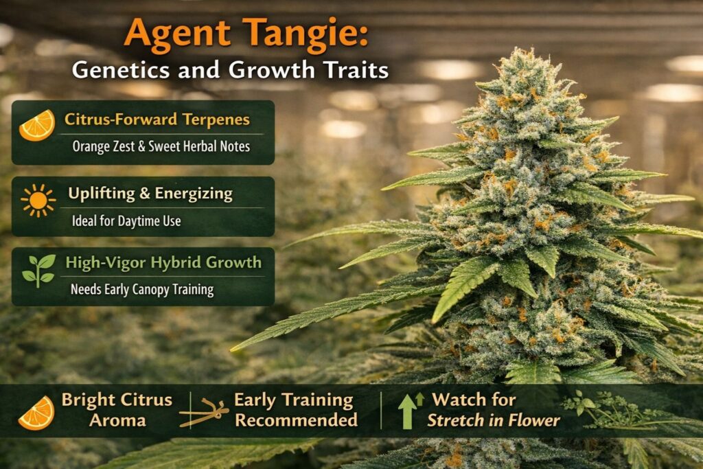 This Agent Tangie Strain Review is not hype. It’s a plain-English guide for growers and shoppers who want effects, flavor, genetics context, and real garden targets. Genetics aren’t a guarantee, so expect phenotype variation (stretch, stacking, finish time). The notes below are from my most recent run and what I’ve seen across multiple plants.