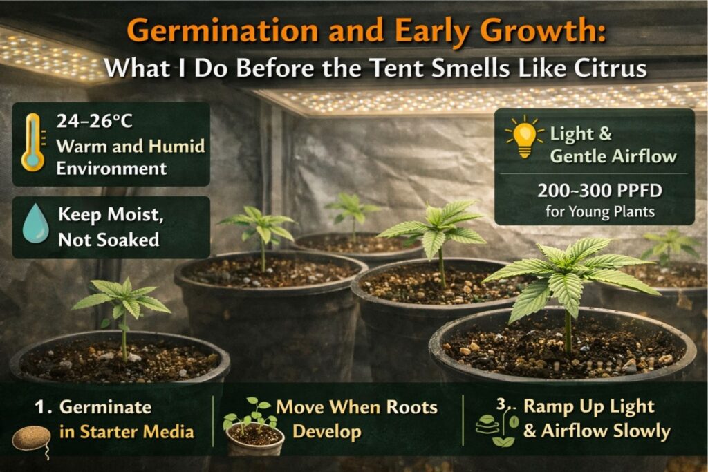 When people ask me how to start weed seeds, my answer is boring on purpose: keep it clean, warm, and not soaked. I germinate in lightly moist starter media at 24–26°C, then move seedlings under gentle light (200–300 PPFD) with steady airflow. Once roots grab, I ramp toward my ppfd map for small tents targets instead of jumping straight to high intensity.