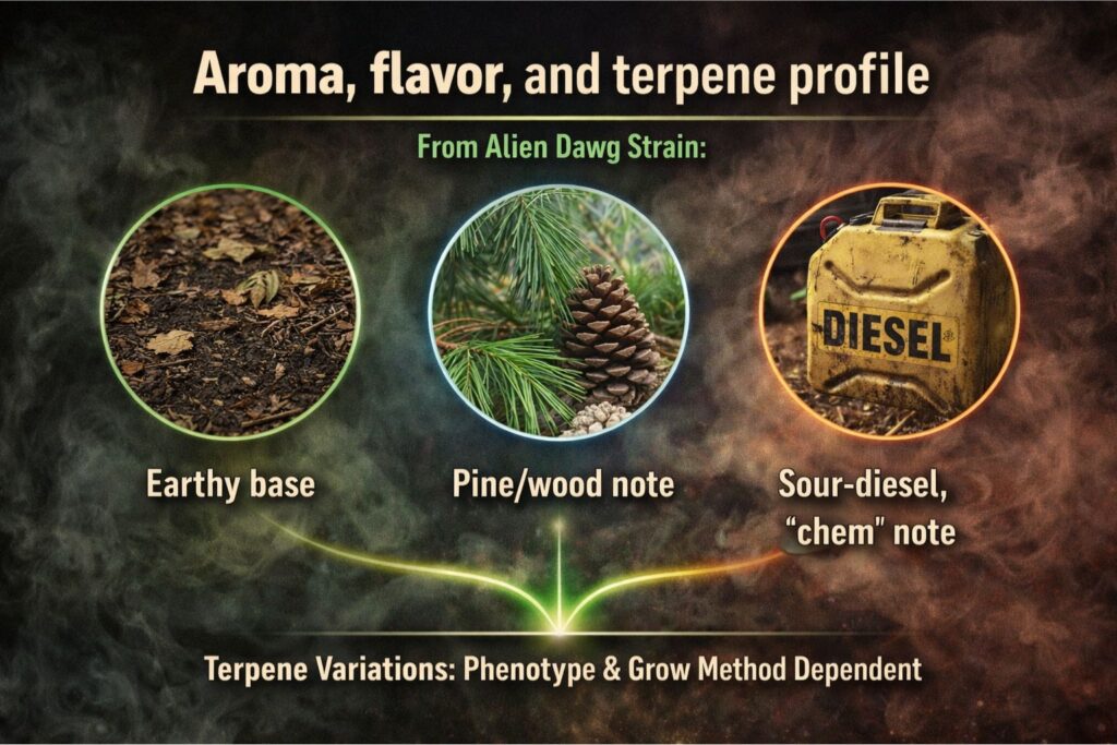 Phenotype variation matters here. One Alien Dawg seeds plant may lean louder into pine and earth, while another leans heavy into sour gas. That’s why I don’t promise one exact flavor outcome. Your terpene profile is also influenced by how you grow (soil vs hydro), how you dry, and how long you cure.