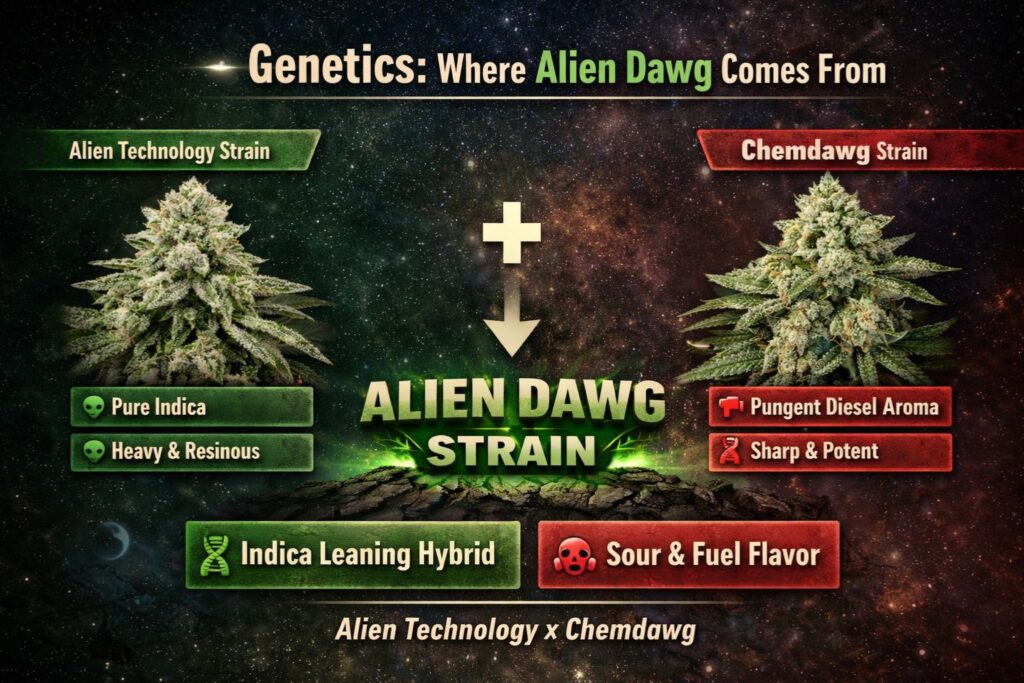 The Alien Dawg strain is commonly described as a cross between the Alien Technology strain and the Chemdawg strain. That pairing is a big reason it attracts growers. The Alien Technology strain is often talked about as a strong indica-leaning line, while the Chemdawg strain is famous for that sharp, sour-fuel punch that shows up in many well-known weed families.