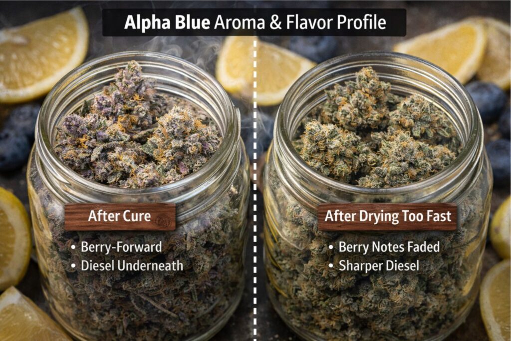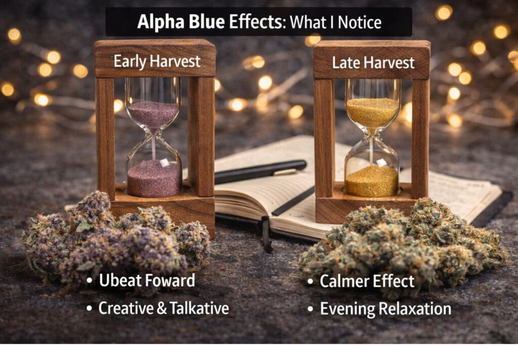 In this Alpha Blue Strain Review, the biggest “effect lever” was harvest timing: