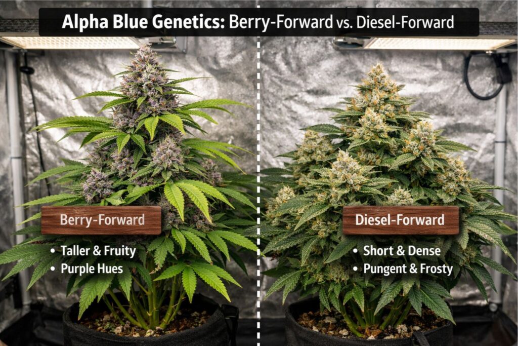 Most lines described as Alpha-Blue come from a “blue” berry-leaning parent crossed with a diesel-leaning parent. In practice, I’d describe it as a hybrid that can stretch like a sativa-leaning plant, but still stacks well if your canopy is even and your environment is stable.