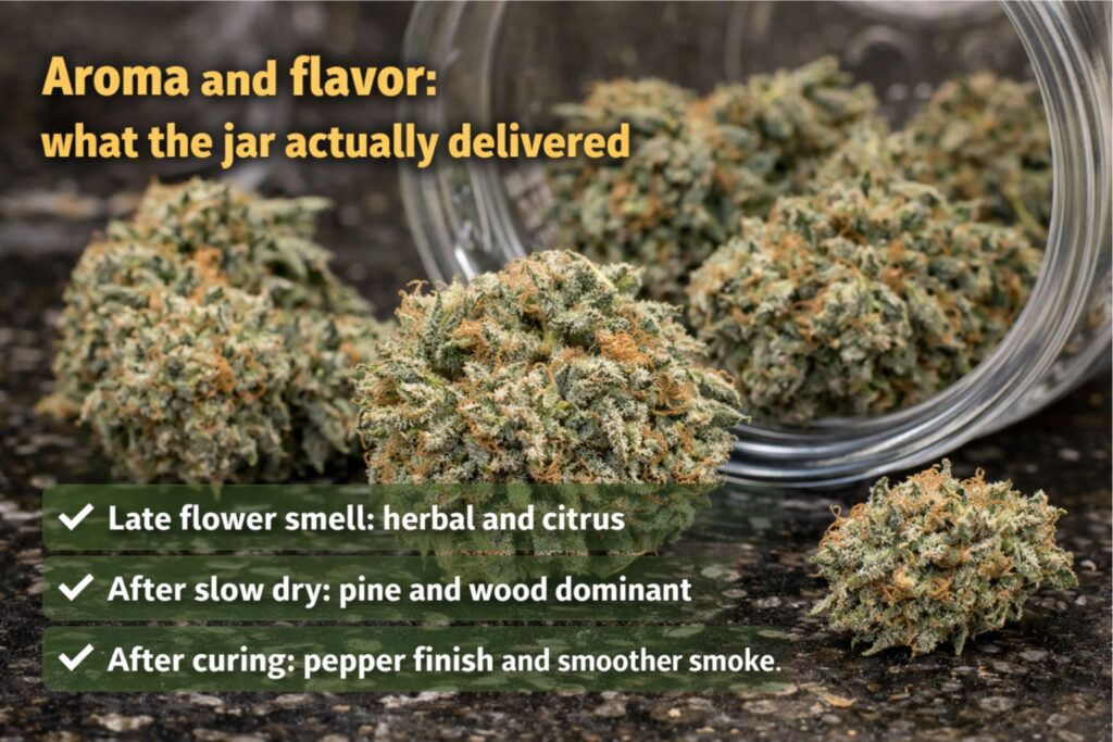 Most people searching American Haze flavor and aroma want something grounded. In my jars, the profile leaned citrus peel, pine, and dry wood, with a peppery finish. It wasn’t candy-sweet. It was bright and outdoorsy, and it got cleaner the longer I cured it.