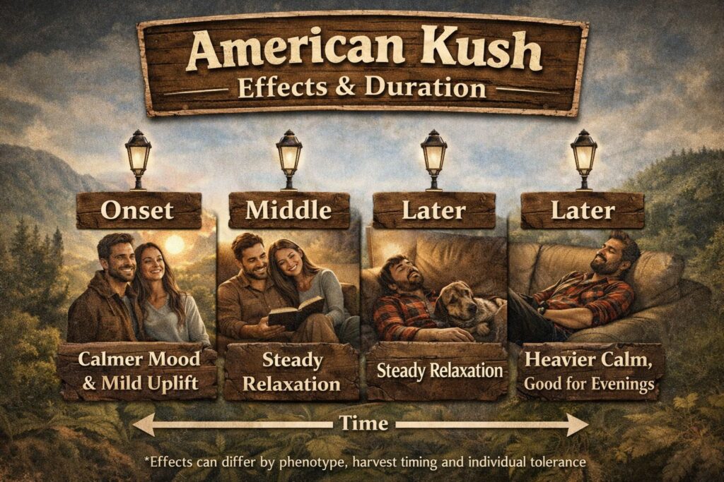 For American Kush strain effects and duration, expect a calm uplift that can lean heavier later, especially with later harvest and longer cure. Start small, take notes, and remember that American Kush strain phenotypes can change the feel.