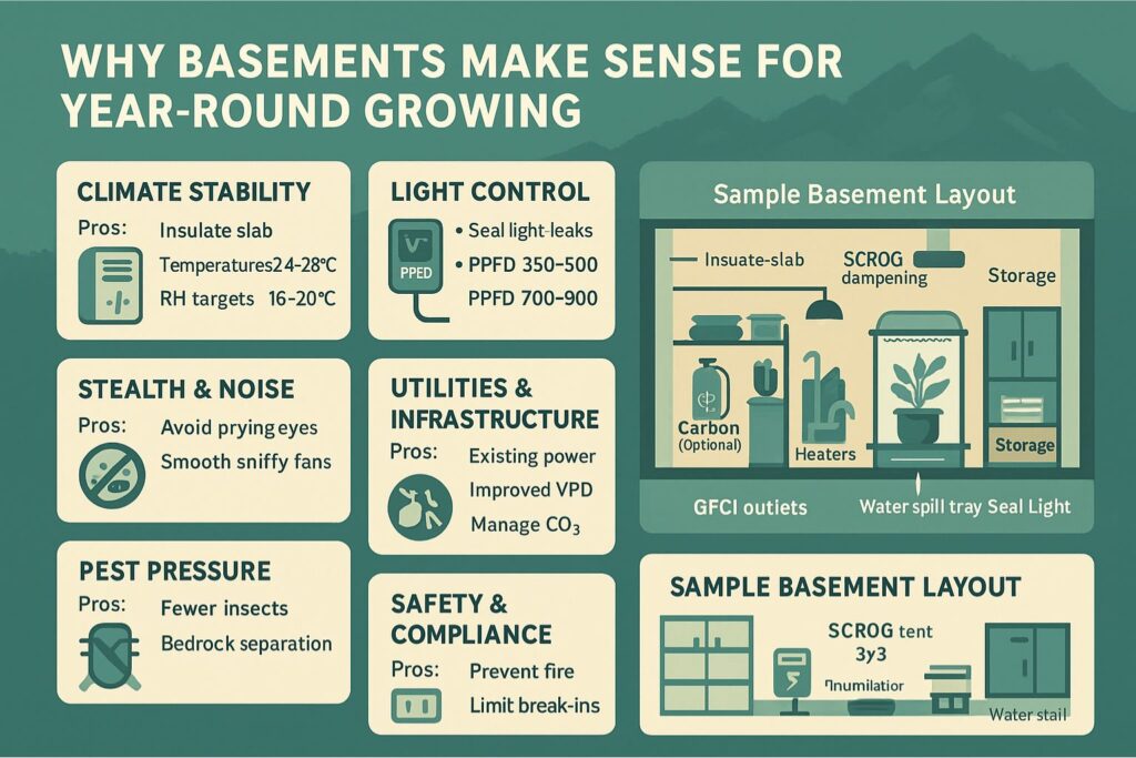 Basements trend toward cooler air, stable temps, and slightly higher relative humidity. Mine sits at 19–21°C most of the year. With lights on, canopy temp climbs to 23–25°C; lights off, it glides back to 18–19°C. If you try to force tropical vigor with high-intensity lighting and heavy feeding, plants stall. The better path is matching genetics, lighting, and nutrition to the environment so your basement cannabis seeds can express fully.
