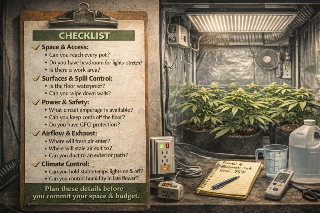 A small tent or a closet can work for one or two plants if you can manage heat and humidity. Plan for the final canopy and keep at least one clear access path. Use the indoor cannabis grow room checklist to confirm you can mount equipment off the floor and still move safely.