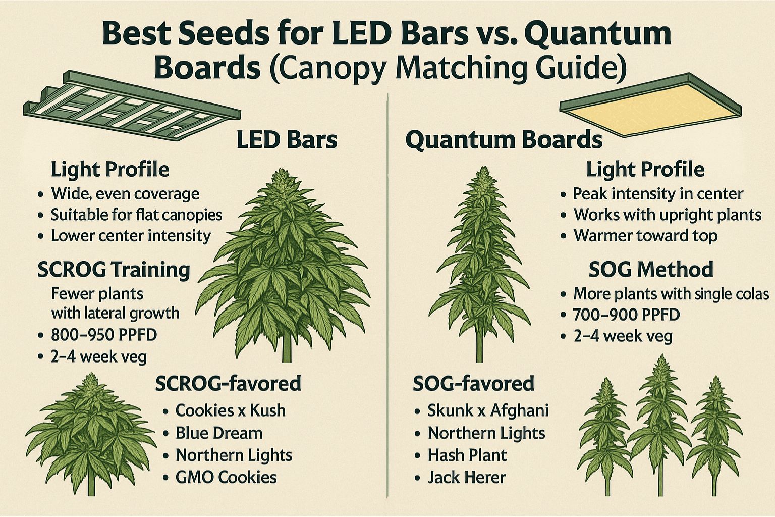 Choosing the best seeds for LED bars or for quantum board grow lights is a canopy decision first and a brand decision second. Bar fixtures reward branching genetics and SCROG training; board fixtures reward upright phenotypes and the SOG method. If you map PPFD, check a VPD chart, and align genetics to your light field, you’ll stop wrestling with height and start harvesting on schedule.
