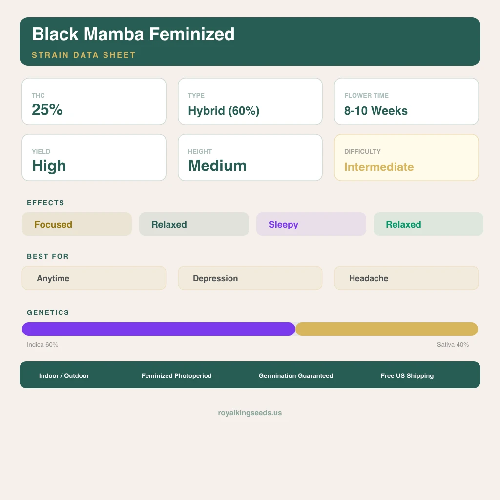 Black Mamba at 25%% THC produces focused, relaxed, sleepy sensations that users consistently describe as versatile enough to serve different purposes depending on dose and setting. Lower doses lean more cerebral and functional. Higher doses bring the body effect forward. The Caryophyllene/Myrcene terpene pairing gives this strain a distinctive effect signature that experienced users recognize as different from other hybrids at similar THC levels.