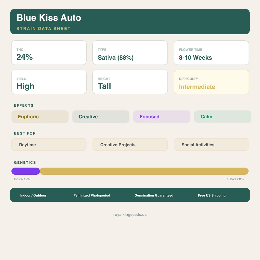We have run Blue Kiss across multiple environments now, and what stands out is the consistency. Whether in a 3x3 tent under LED or a 4x4 with HPS, this sativa delivers a pinene-forward flower at 24% THC that matches the genetic promise. The 12/88 profile shows in how the plant structures itself — vertical, energetic, always reaching for the light. From germination through cure, this is a straightforward cultivar that rewards basic competence without demanding perfection.