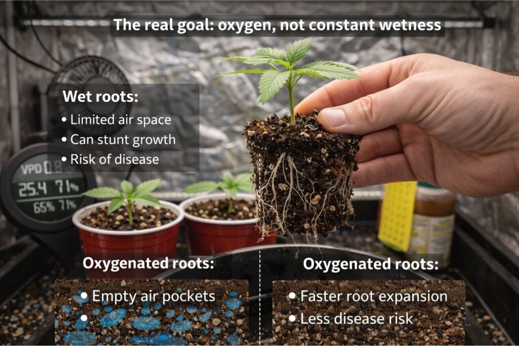 A seedling’s roots need moisture, but they also need air. Many “overwatering” issues are actually “under-oxygenation” issues. When the pore spaces in your medium fill with water for long periods, roots slow down. Slow roots mean less uptake, which leads to pale growth, droop, and sometimes disease.