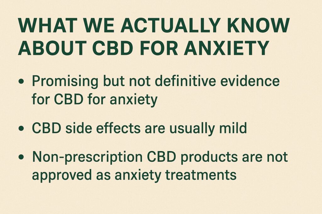 Several small clinical trials and reviews suggest that CBD for anxiety has potential, particularly for social anxiety and other anxiety-related concerns, but the research is still early and often based on limited sample sizes. Some studies have looked at simulated public speaking, where a single dose of CBD reduced measured anxiety compared to placebo.