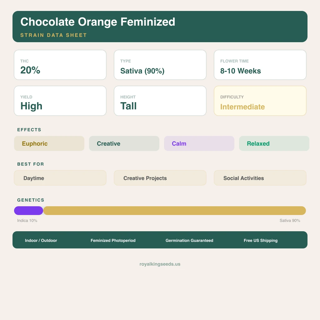 We have run Chocolate Orange across multiple environments now, and what stands out is the consistency. Whether in a 3x3 tent under LED or a 4x4 with HPS, this sativa delivers a limonene-forward flower at 20% THC that matches the genetic promise. The 10/90 profile shows in how the plant structures itself β vertical, energetic, always reaching for the light. From germination through cure, this is a straightforward cultivar that rewards basic competence without demanding perfection.