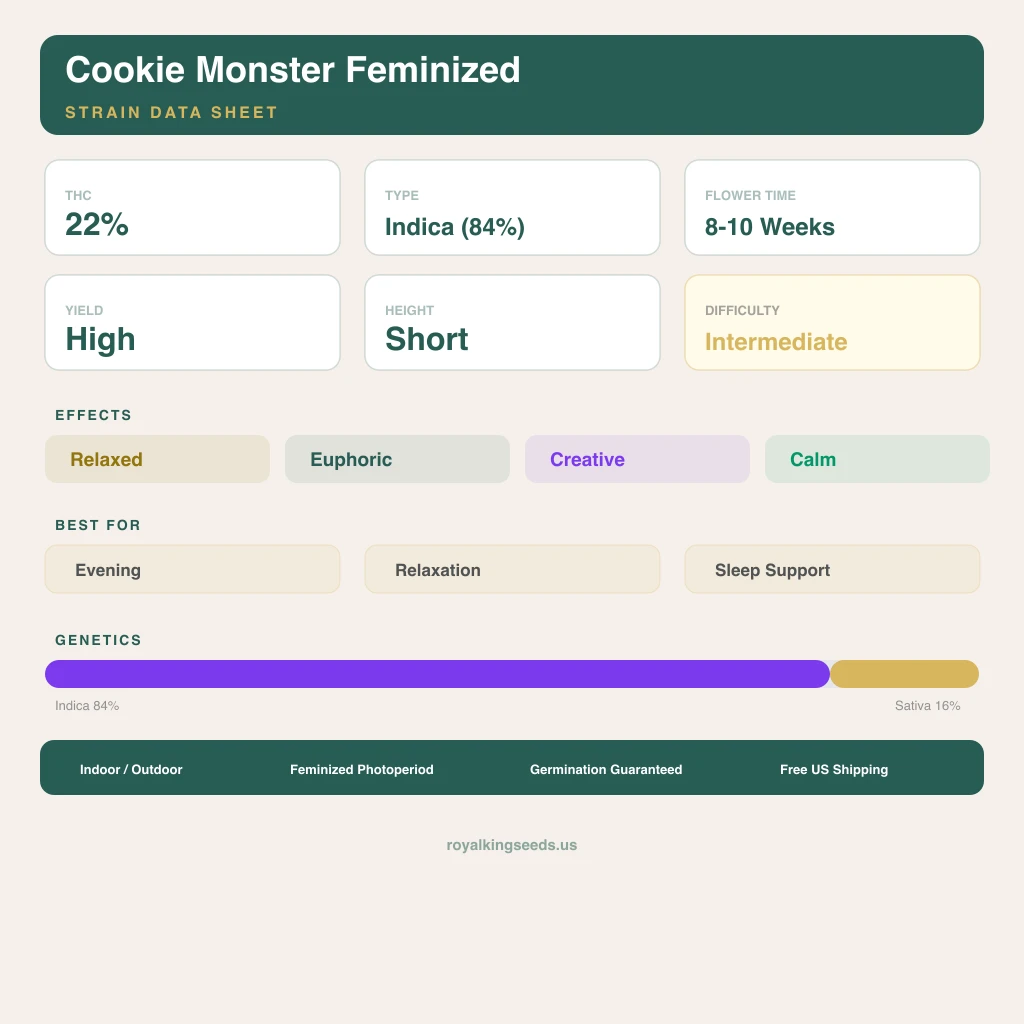 The most common mistake growers make with Cookie Monster is underestimating how dense the flower structure gets in weeks 6-8, leading to humidity problems inside the buds when airflow is inadequate. This is a strain that demands attention to canopy airflow in late flower β not because it is fragile, but because the dense ${indica}/${sativa} structure traps moisture if you do not proactively manage it. At 22% THC with caryophyllene-dominant terpenes, the quality ceiling is high β but you have to manage the specific characteristics of this cultivar to reach it.