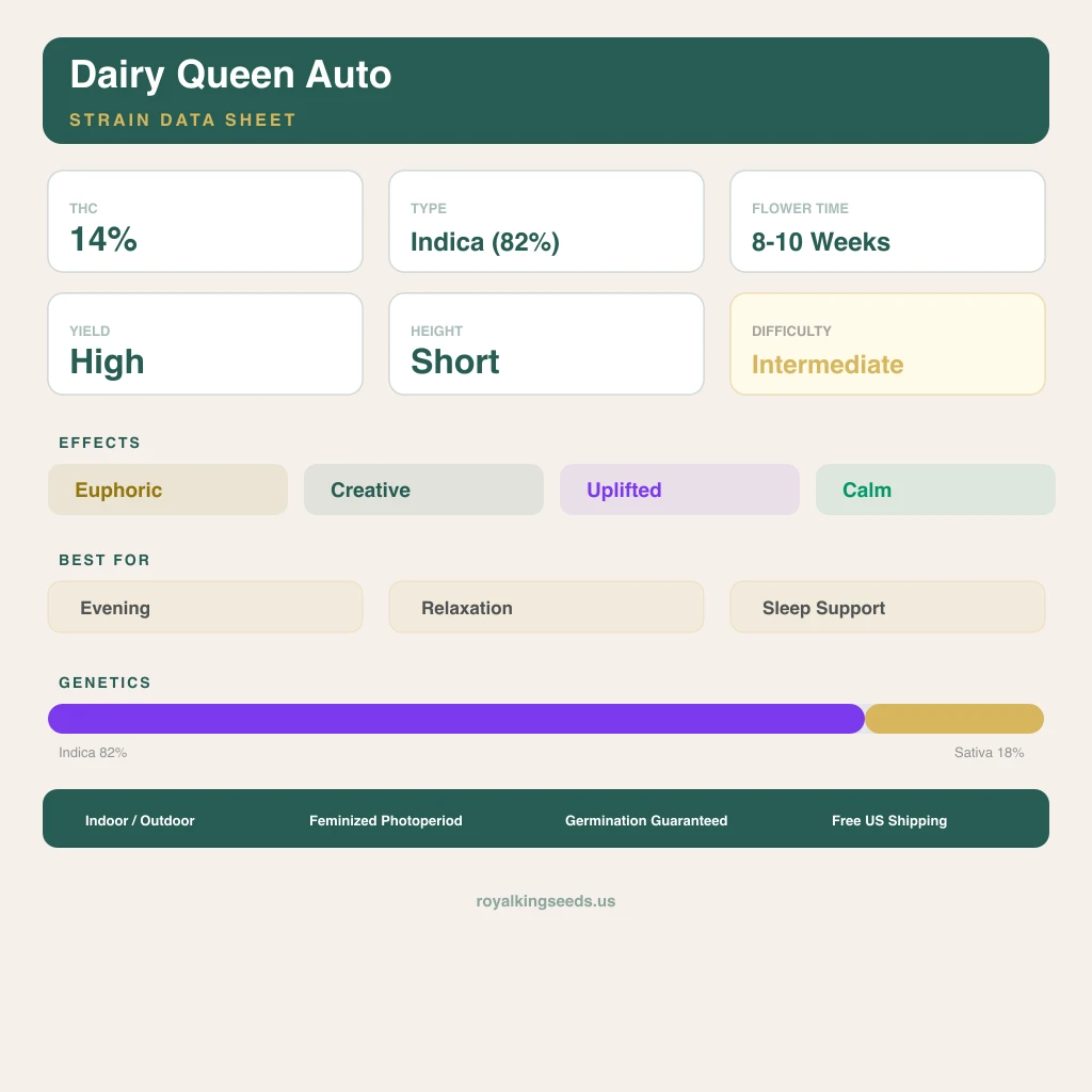 We have run Dairy Queen across multiple environments now, and what stands out is the consistency. Whether in a 3x3 tent under LED or a 4x4 with HPS, this indica delivers a myrcene-forward flower at 14% THC that matches the genetic promise. The 82/18 profile shows in how the plant structures itself — bushy, compact, eager to fill lateral space. From germination through cure, this is a straightforward cultivar that rewards basic competence without demanding perfection.