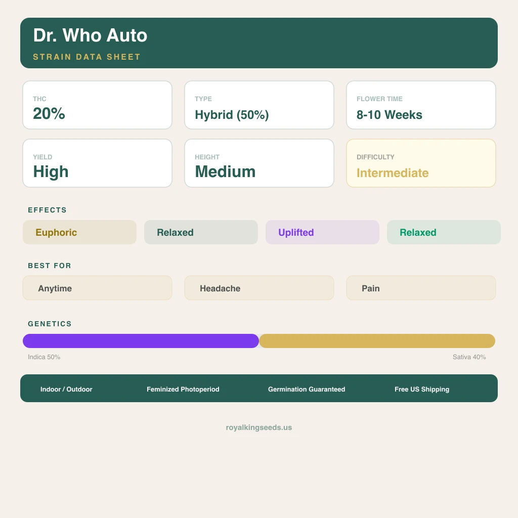 At 20%% THC, Dr. Who delivers euphoric, relaxed, uplifted effects with a caryophyllene-influenced character. The onset is balanced — head and body arrive together and remain proportional throughout a 2-3 hour duration. This makes the strain adaptable to different situations depending on dose. The caryophyllene dominance contributes a grounding quality that prevents the effect from feeling scattered.