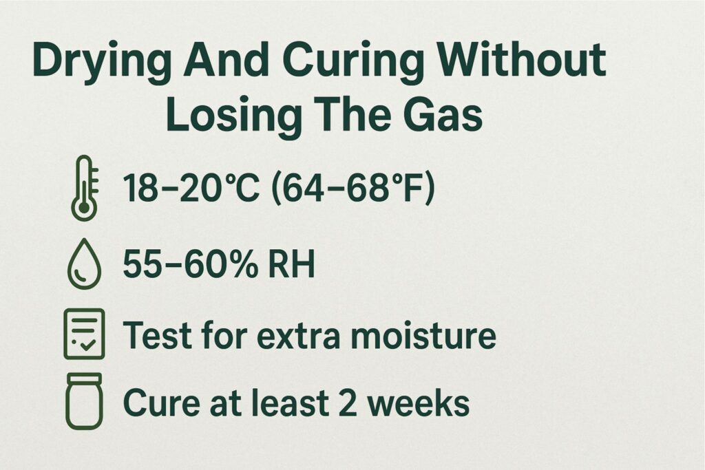 - Trim, then jar with small hygrometers at 58–62 percent