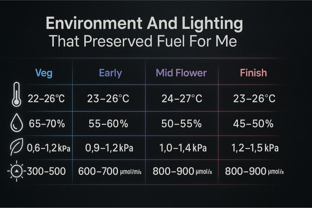 - Veg: 24–27°C, 62–70 percent RH, VPD 0.8–1.1 kPa