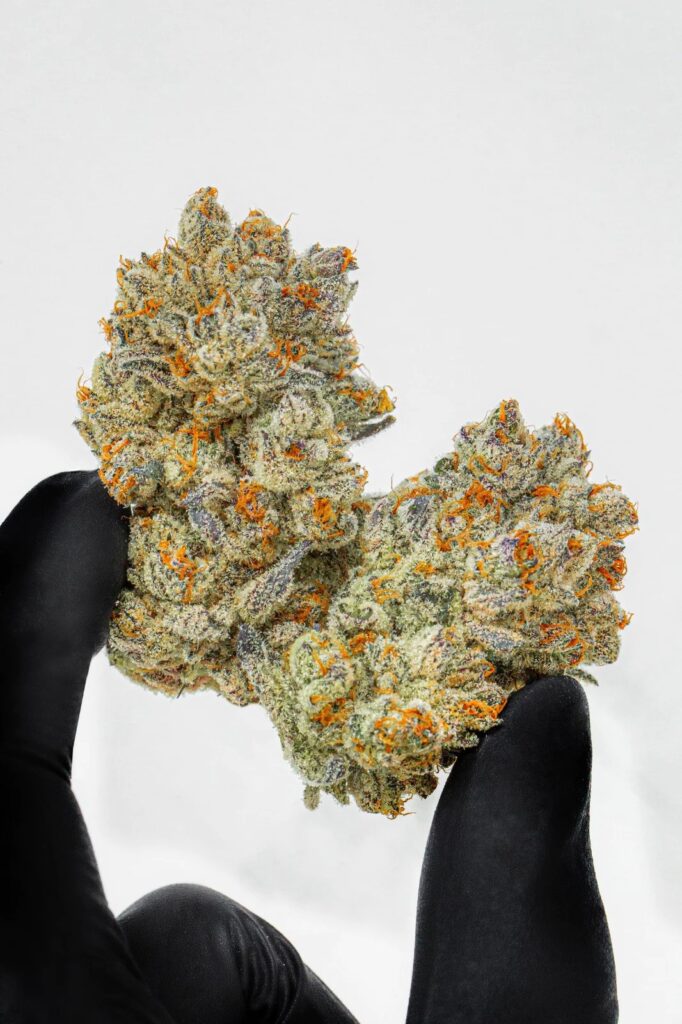 GSC is also noted for its striking orange pistils, which weave through the frosty leaves. These pistils, which emerge pale and gradually darken to bold orange as the plant matures, are crucial for reproduction but also add a visual depth that enhances the strain’s aesthetic appeal.