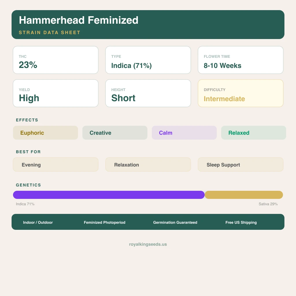 We have run Hammerhead across multiple environments now, and what stands out is the consistency. Whether in a 3x3 tent under LED or a 4x4 with HPS, this indica delivers a linalool-forward flower at 23% THC that matches the genetic promise. The 71/29 profile shows in how the plant structures itself β bushy, compact, eager to fill lateral space. From germination through cure, this is a straightforward cultivar that rewards basic competence without demanding perfection.