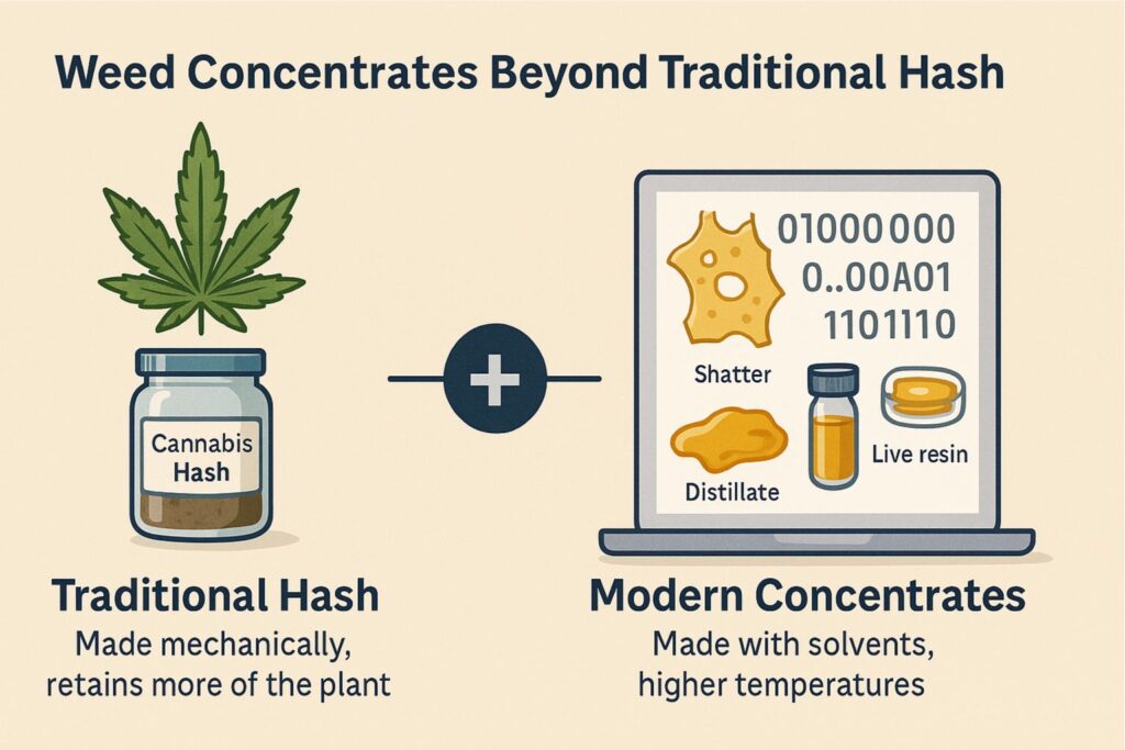 When people hear the phrase weed concentrates today, they may think of shatter, wax, distillate, or live resin. Traditional cannabis hash sits alongside these. The main differences are the solvents used, the temperatures involved, and how much of the original plant essence survives.