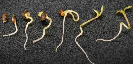 The seed absorbs moisture, swells, and cracks open. A white taproot emerges and soon after, the first embryonic leaves (cotyledons) push upward.