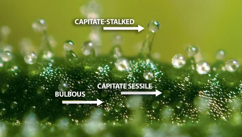 - Capitate-sessile trichomes: Slightly smaller than capitate-stalked trichomes, these trichomes lack a stalk but also produce cannabinoids and terpenes.