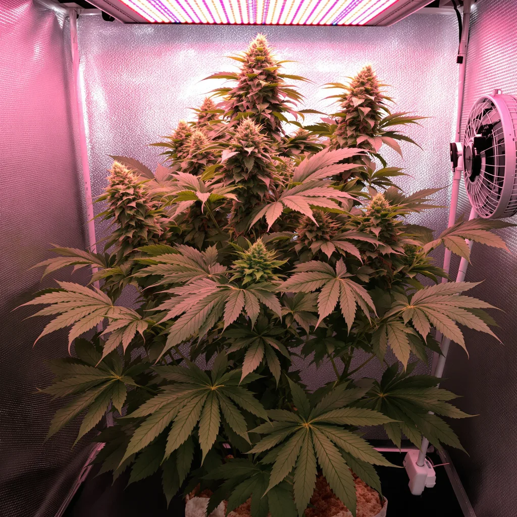 The dominant phenotype — which appears in roughly 70-75% of seeds — produces a compact, symmetrical plant with broad internodes and heavy lateral branching. Fan leaves are wide and dark green, typical of the indica heritage. Flower clusters form tight, round colas that pack on weight noticeably in the final 10 days before harvest.