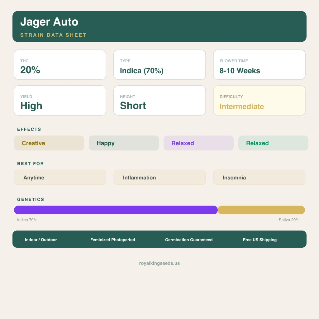 The genetic expression of Jager — a 70/20 indica — varies meaningfully across phenotypes. Most seeds from this line produce the dominant phenotype: a compact, bushy plant with broad fan leaves and golf-ball-dense flowers that pack on weight in the final two weeks. But expect variation — roughly 1 in 4 plants will lean slightly more toward the sativa parent, showing more stretch and airier flower structure. THC testing at 20%% across phenotypes, with Caryophyllene consistently dominant.