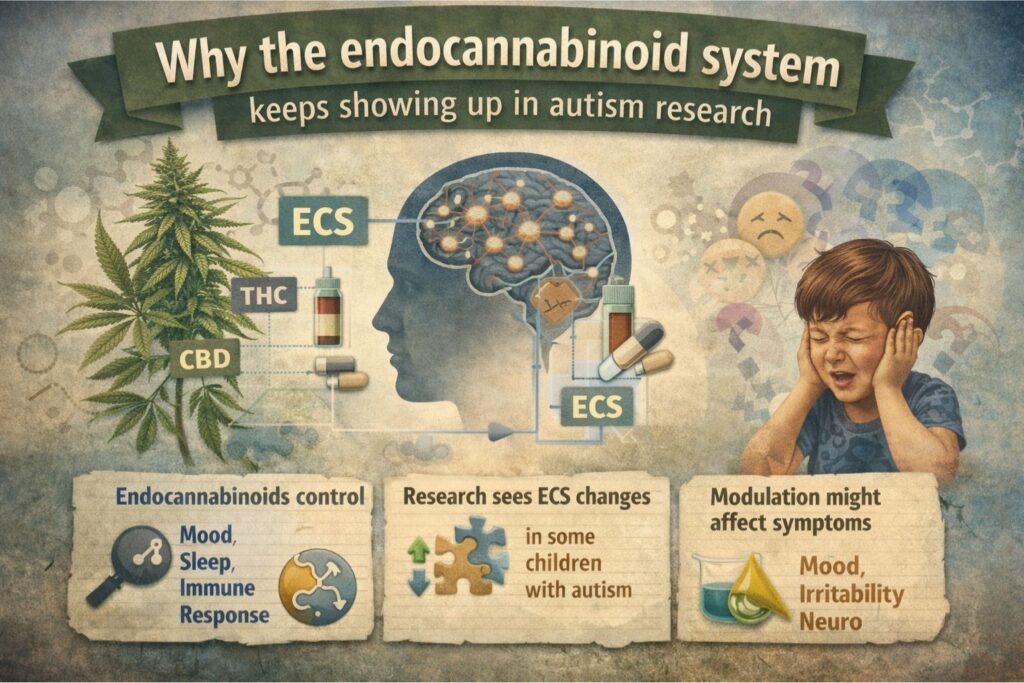 One reason cannabis gets discussed in autism circles is the endocannabinoid system (ECS). The ECS is a signaling network involved in neuromodulation, stress response, appetite, and immune signaling, among other functions. Researchers have explored whether ECS differences show up in autism and whether modulating ECS pathways might affect certain symptoms.
