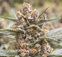 - A heavy coating of trichomes, making the buds incredibly sticky and potent.