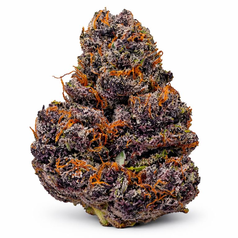 Growers often finish this cultivar with tight, frosty flowers that can show deep greens and purples, bright pistils, and a heavy trichome coat.