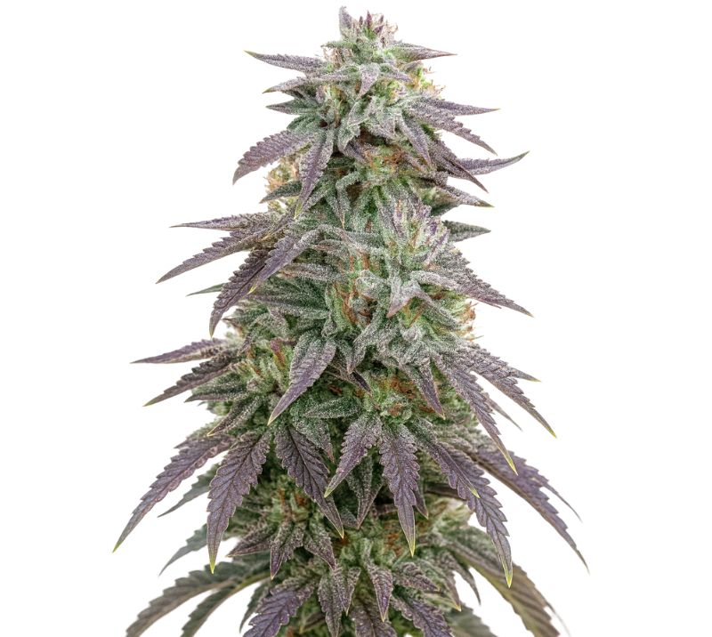 The trichomes, crystalline structures that house the plant’s potent cannabinoids and terpenes, shimmer like morning dew, giving the mature buds a frosted appearance. Under the right light, this resinous sheen accentuates the plant’s allure, promising potency and sensory delight. The leaves, too, play their part in this visual narrative. Broad, serrated, and deep green, they frame the vibrant buds, sometimes adopting subtle purple undertones that further amplify the plant’s aesthetic appeal.