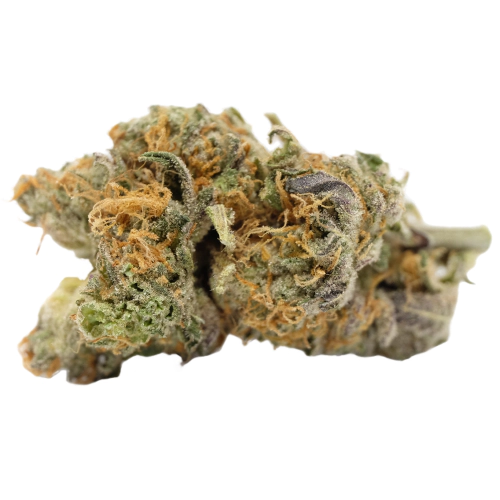 The buds are dense and compact, adorned with a tapestry of colors ranging from bright green to shades of purple, the latter being a genetic gift from its Cheese ancestry. These colorful buds are intertwined with vibrant orange pistils, which curl and twist among the trichome-laden calyxes.