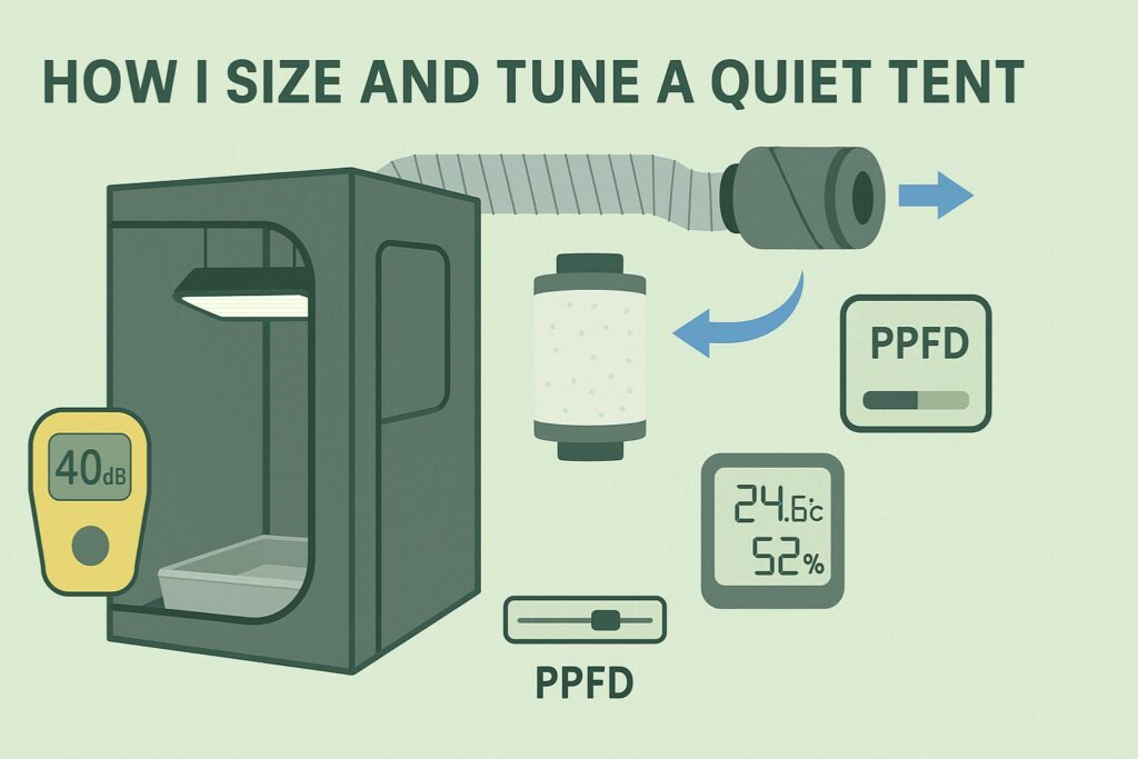 When I say low-CFM, I’m talking about 4-inch or 6-inch inline fans run at 25–50% speed, often 60–120 CFM total after duct and filter losses. That airflow maintains slight negative pressure in a carbon filter grow tent but doesn’t pull so hard that it whistles. The tradeoff is simple: with less forced exchange, the tent relies on tight environmental control, steady transpiration, and cultivars that thrive under moderate leaf temperatures and restrained terpene push. If you keep PPFD for cannabis in an efficient range and manage VPD, the plants stay happy and the apartment stays calm.