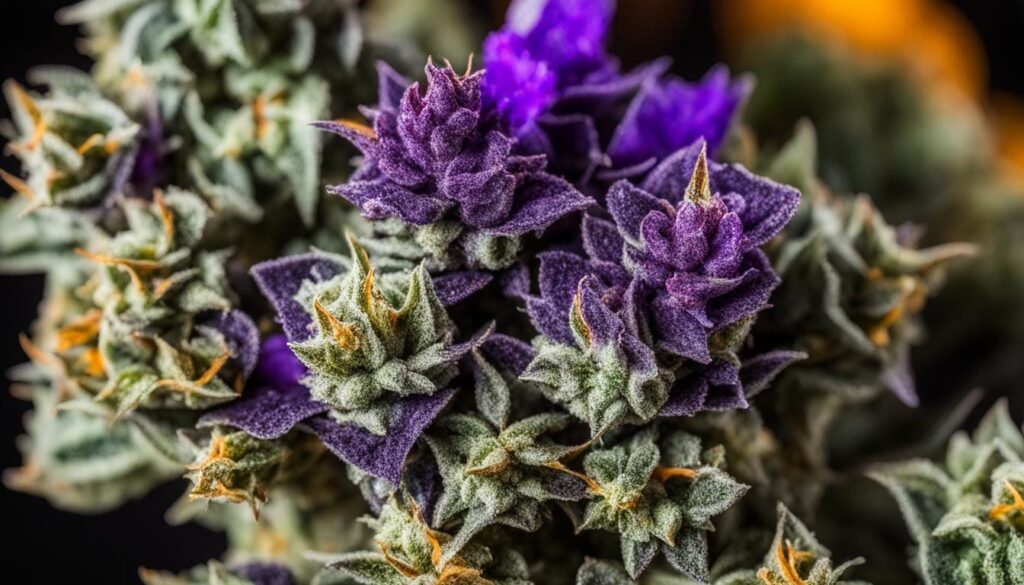 Peeking through this frosty veil, one can also observe the fine hairs, or pistils, that weave throughout the buds. These pistils, ranging in color from bright orange to a more subdued amber, add a final touch of contrast to the buds’ already vibrant color scheme. The interplay of colors and textures makes Runtz not just a strain to be consumed, but a work of art to be admired.