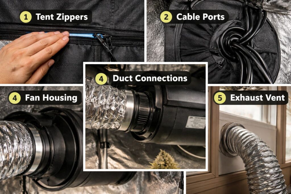 If a leak is hard to locate, I do a ducting leak test by turning off all oscillating fans, setting the exhaust to a steady speed, and using a small strip of tissue near suspected gaps. The tissue flutter tells you where air is escaping.