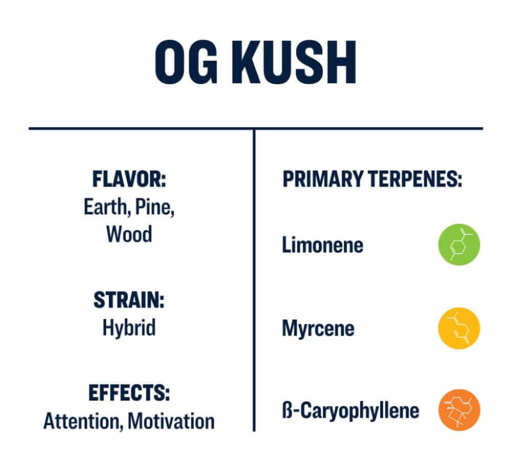 - Linalool contributes a floral, lavender scent and is associated with anti-anxiety and sedative effects. Although present in smaller amounts in OG Kush, it enhances the strain’s overall calming and pain-relieving properties.