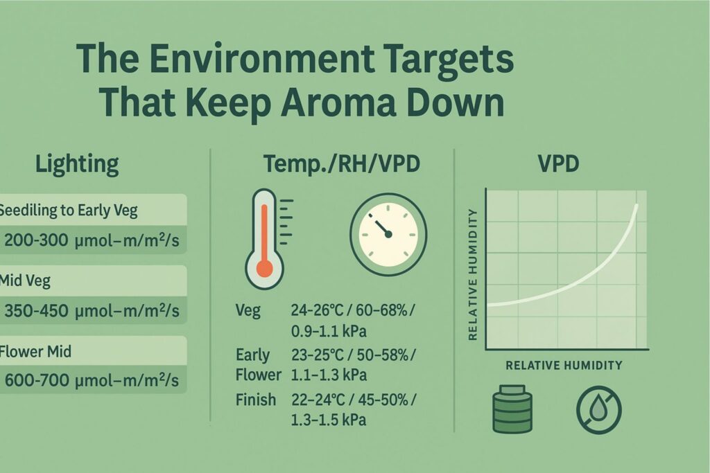 - Odor control: Keep late-flower RH 45–50% to lock scent in the buds